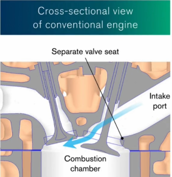 En los motores convencionales, el diseño del puerto de admisión se ve limitado por la necesidad de asientos de válvula sinterizados y ajustados a presión, lo que limita la capacidad de optimizar la forma del puerto para un flujo de pulverización ideal.