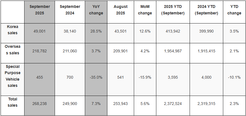 En su mercado local, vendió 49,001 unidades, teniendo un aumento de 28.5%. La compañía reporta que debido el mayor número de días hábiles de septiembre de este año generó un efecto que impulsó las ventas en comparación con el año pasado, cuando Corea del Sur celebró su festividad nacional de Acción de Gracias, el Chuseok, ese mismo mes.