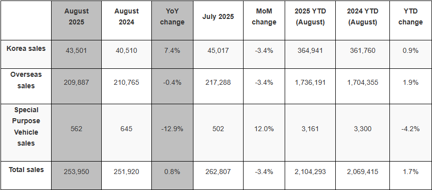 Las ventas fuera de Corea, excluyendo vehículos especiales, disminuyeron un 0.4% hasta las 209,887 unidades.
