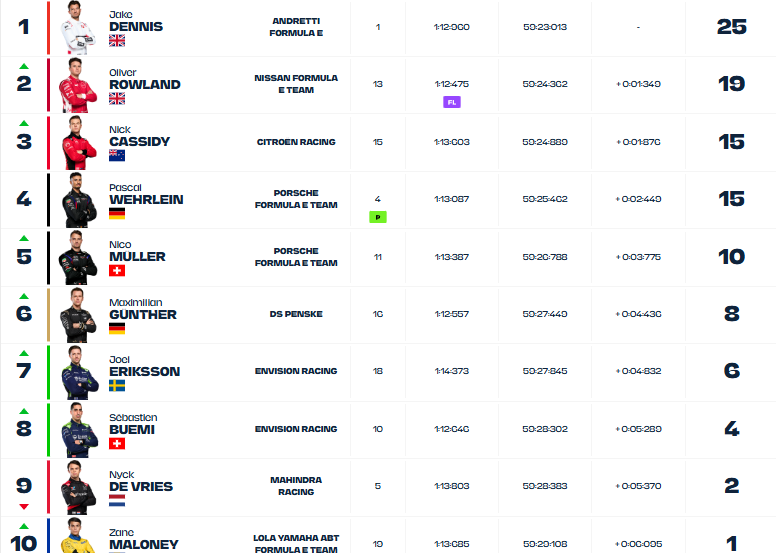 Un fuerte accidente del debutante Pepe Martí de CUPRA KIRO, (quien voló espectacularmente sobre Antonio Félix da Costa de Jaguar TCS Racing y, afortunadamente, terminó aterrizando sin consecuencias graves) provocó una bandera roja tardía y un sprint final de una vuelta. Dennis logró contener al campeón defensor Oliver Rowland de Nissan Formula E Team, que había arrancado desde la posición 13, y también a Cassidy, para llevarse la primera victoria de la temporada.