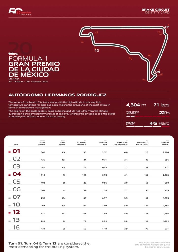 Según los técnicos de Brembo, el Autódromo Hermanos Rodríguez, de 4,304 metros de longitud, está clasificado como un circuito muy exigente para el sistema de frenos.