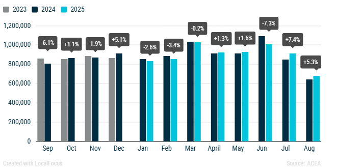 De acuerdo con el reporte de ventas de agosto de la Asociación Europea de Fabricantes de Automóviles (ACEA), en lo que va de año, la venta de vehículos nuevos en la UE ha disminuido ligeramente 0.1% en comparación con el mismo período del año anterior, a pesar de marcar un segundo mes consecutivo de crecimiento positivo.