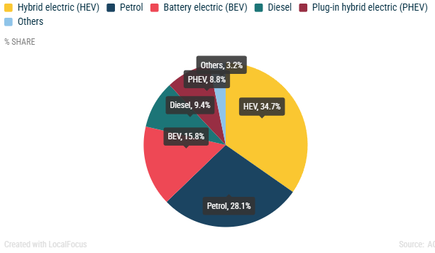 La cuota de mercado de vehículos eléctricos de batería en el mismo periodo se mantuvo en 15.8%, aún por debajo del ritmo necesario en esta etapa de la transición. El mercado de vehículos híbridos-eléctricos siguió siendo el tipo más popular entre los compradores.