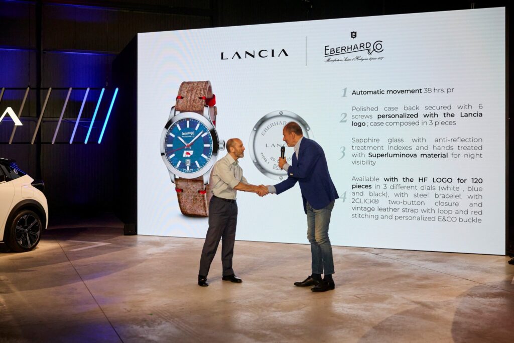Con motivo de la presentación del nuevo Lancia Ypsilon HF de 280 CV y la línea Ypsilon HF en el circuito de pruebas de Balocco, Lancia y Eberhard & Co. presentaron un exclusivo reloj de edición limitada, fruto de la colaboración entre la histórica marca automovilística y la Maison relojera suiza.