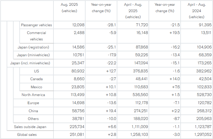 En el octavo mes, la compañía japonesa vendió 251,081 unidades, teniendo un crecimiento de 2.8%. Las ventas ultramar crecieron 6.6% con 225,734 unidades. Siendo China en donde más crecieron con 19.4% y 58,756 unidades vendidas, mientras que en Estados Unidos sus ventas crecieron 12.7% con 80,932 unidades, en México las ventas crecieron 10.1% con 23,805 unidades. Por el contario, sus ventas en Europa cayeron 13.6% con 14,698 unidades y en el resto de sus mercados las ventas cayeron 10.0%.