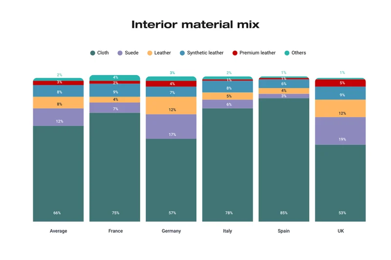 Alemania (57%) y el Reino Unido (53%) muestran una fuerte preferencia por los materiales premium frente a la tela, con clientes que gastan entre 500 y 1,000 € o más en interiores de cuero. Esta disposición a mejorar crea claras oportunidades de venta en estos mercados.