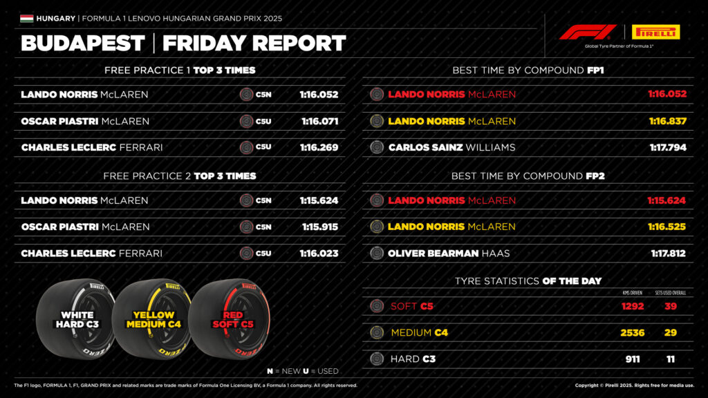 McLaren no tardó en imponer su autoridad durante el fin de semana del Gran Premio de Hungría. Lando Norris y Oscar Piastri, en ese orden, lideraron la tabla de tiempos en la FP1 y la FP2, siendo los únicos pilotos que bajaron de la barrera de 1’16». Los mejores tiempos en la segunda hora fueron 1’15″624 y 1’15″915. Ferrari parecía ser la segunda fuerza, con Leclerc tercero en 1’16″023 y Hamilton sexto en 1’16″329. Dividiendo la dupla del Cavallino Rampante en la FP2, estaban los Aston Martin de Lance Stroll cuarto en 1’16″119 y Fernando Alonso quinto en 1’16″233. En la FP1, Felipe Drugovich sustituyó al español.
