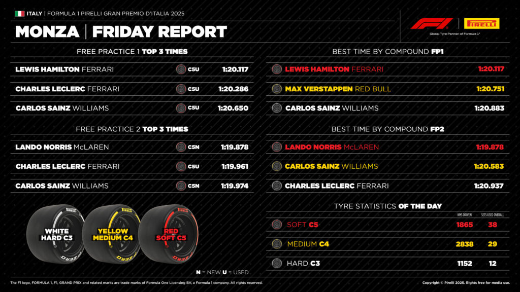 Así como ocurrió en Monza el año pasado, diez pilotos dieron vueltas con menos de cuatro décimas de diferencia en la FP2, por lo que la clasificación promete ser una batalla muy emocionante para decidir las posiciones en parrilla para la carrera del domingo por la tarde. Lewis Hamilton fue el más rápido en la primera sesión (1’20″117) por delante de su compañero de equipo, Charles Leclerc (1’20″286). Mientras que Lando Norris encabezó la tabla de tiempos en la segunda sesión con un tiempo de 1’19″878, 83 milésimas más rápido que Leclerc y 96 más rápido que Carlos Sainz (Williams), quien ha sido compañero de ambos pilotos, con el inglés en McLaren y el monegasco en Ferrari. El español fue tercero en la FP1 con un tiempo de 1’20″650.