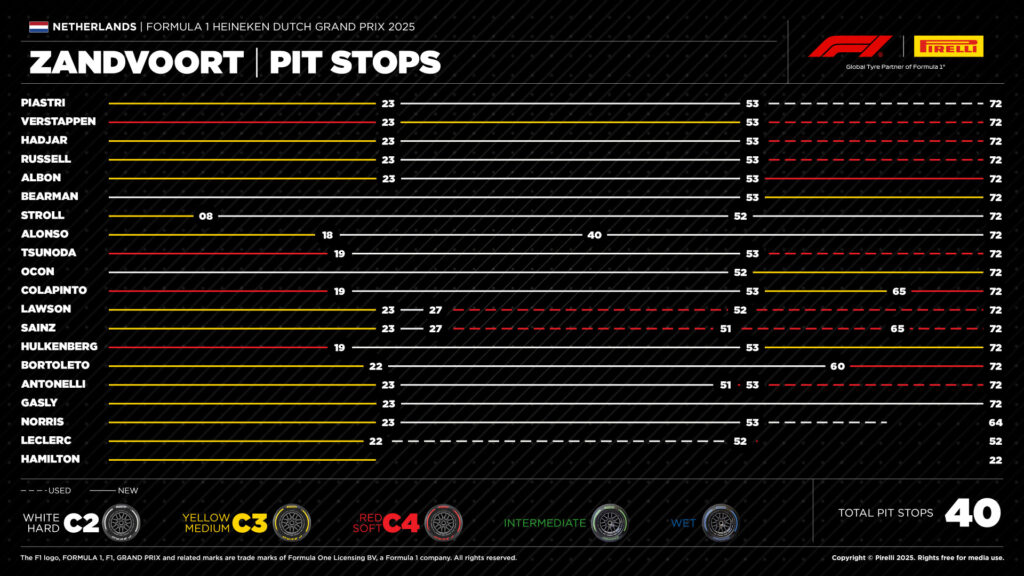 «En cuanto a los neumáticos, el aspecto más positivo de este fin de semana es que, a pesar de que trajimos un trío de compuestos para seco más suaves que el año pasado, los tres demostraron ser competitivos en carrera, como se puede apreciar en la forma en que se repartió el kilometraje entre ellos (como se mencionó anteriormente). El compuesto duro hizo la mayor parte del trabajo, ofreciendo un buen rendimiento durante tandas muy largas, por ejemplo, para los dos pilotos de Haas, que cubrieron más de dos tercios de la carrera con un solo juego de neumáticos C2. Este compuesto se comportó mejor que en las tres sesiones de entrenamientos libres, lo que permitió a los pilotos presionar al máximo inmediatamente después de los reinicios. Aquellos como los pilotos de McLaren y Aston Martin que pudieron reservar ambos juegos para la carrera se beneficiaron de ello. En cuanto al compuesto medio y el suave, su rendimiento fue bastante similar, lo cual es importante, especialmente en el caso del más suave. Ahora nos dirigimos al Gran Premio de casa de Pirelli, donde celebraremos con todos los aficionados el hito alcanzado hoy: 500 participaciones en Grandes Premios de Fórmula 1, lo que nos convierte en el proveedor de neumáticos con más apariciones en la categoría reina del automovilismo. Es un orgullo y el resultado de la pasión, la experiencia y el compromiso demostrados por tantos hombres y mujeres que han trabajado en Pirelli desde la década de 1950. ¡Comenzaremos a contar desde Monza!«