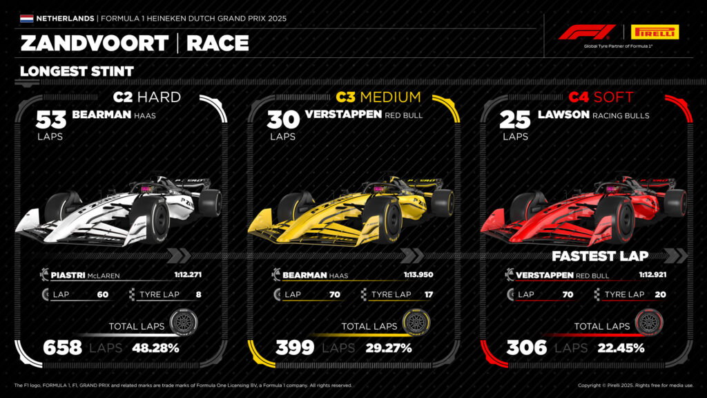 El compuesto C2 fue el más usado, cubriendo casi el 50% de las vueltas completadas (658 vueltas, 48.28%), seguido del Medio (399, 29.27%) y el Suave (306, 22.45%). El Periodo más largo en general lo completó Bearman con el Haas, quien dio 53 vueltas con el duro, mientras que Verstappen fue el que más avanzó con el medio (30), y Lawson lo hizo con los suaves con 25.