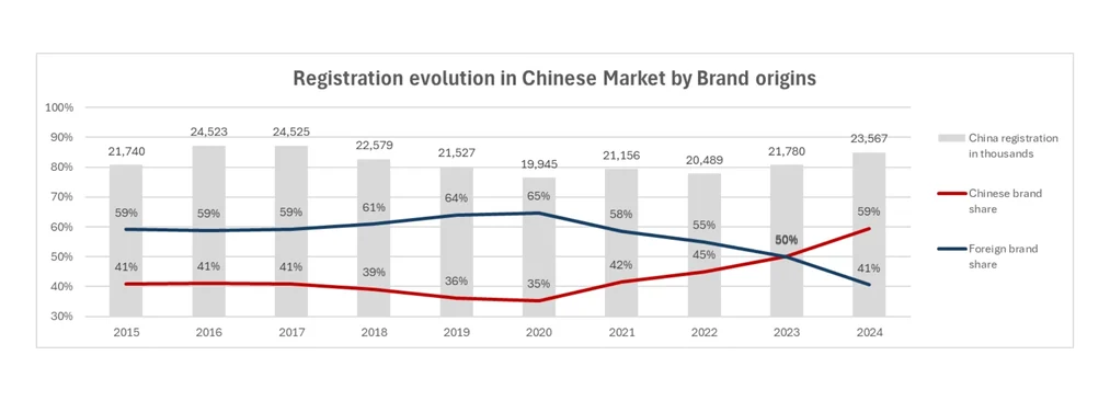 China es el mayor mercado automotriz del mundo. Con más de 23 millones de vehículos matriculados en 2024, representa por sí solo aproximadamente el 30% de las matriculaciones anuales mundiales. Hasta 2022, el mercado chino estaba liderado predominantemente por fabricantes de equipos originales (OEM) extranjeros, lo que lo convertía en un centro de volumen crucial para marcas automotrices extranjeras como Volkswagen, Toyota y Honda.