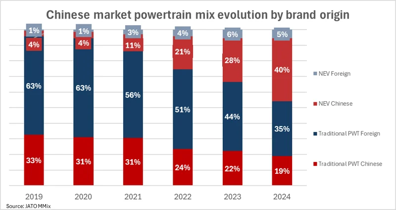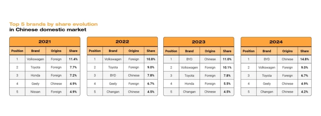 Sin embargo, tras la pandemia de COVID-19, se produjo un cambio significativo. A partir de 2021, las marcas chinas comenzaron a tomar impulso, marcando el comienzo de lo que podría describirse como un renacimiento para los fabricantes nacionales. Para 2023, sus volúmenes combinados alcanzaron la paridad con los de las marcas extranjeras, y en 2024, las superaron considerablemente, obteniendo el 59% de la cuota del mercado local.