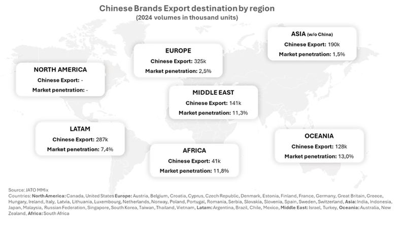 Un análisis profundo de las exportaciones automotrices chinas muestra que, al día de hoy, las marcas chinas exportan aproximadamente el 2.1 % del volumen mundial de vehículos. Su penetración de mercado supera el 10% en regiones como Oceanía, Oriente Medio y África. En otros países asiáticos, los volúmenes de exportación se mantienen relativamente bajos, a pesar del sólido desempeño en Rusia, donde muchos fabricantes de equipos originales chinos establecieron producción local durante la guerra de Ucrania. Allí, las marcas chinas controlan ahora casi el 50% del mercado, beneficiándose de la retirada de las marcas de la UE. También en el Sudeste Asiático, la cuota de mercado de las marcas chinas crece de forma constante; sin embargo, su presencia aún es limitada en mercados regionales clave como India, Japón y Corea del Sur.